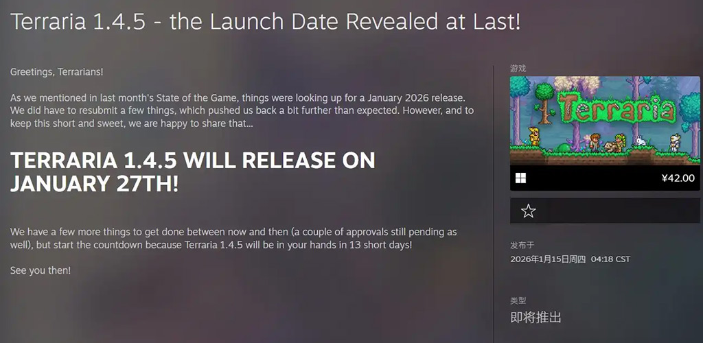 官方宣布!《泰拉瑞亚》1.4.5版本定档!