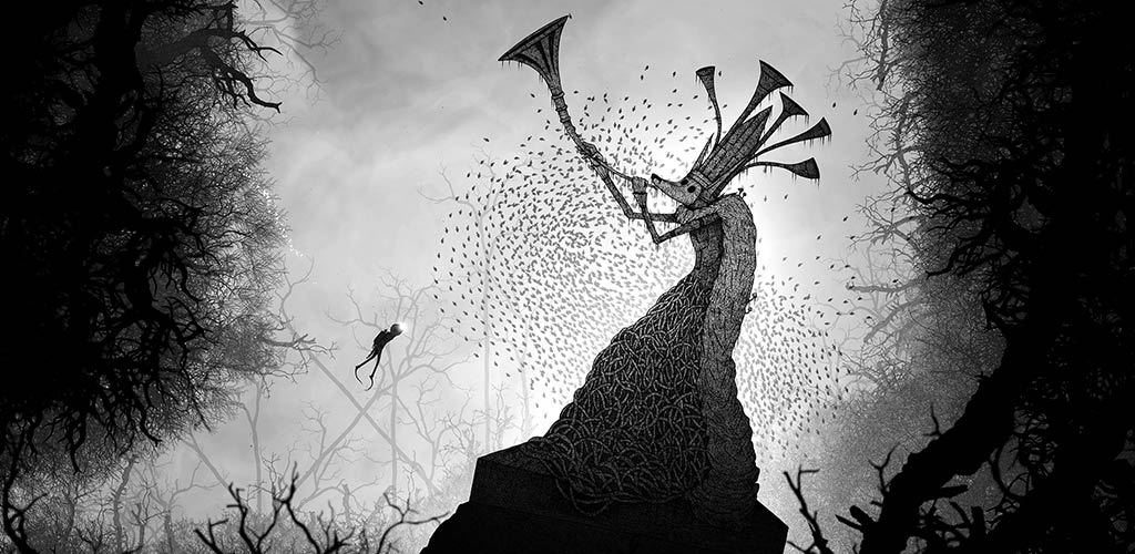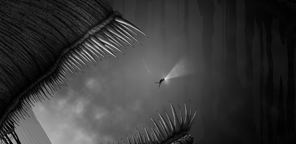 请注意,这里没有五彩斑斓的海底世界,只有黑白影调勾勒出令人屏息的压抑感,以及错乱线条构成的诡异地貌:巨大的扭曲生物、锈迹斑斑的神秘机械、以及散发着微光的古老遗迹。独自潜入深海,来探索吧,一段令人不安的旅程正等待着你......
